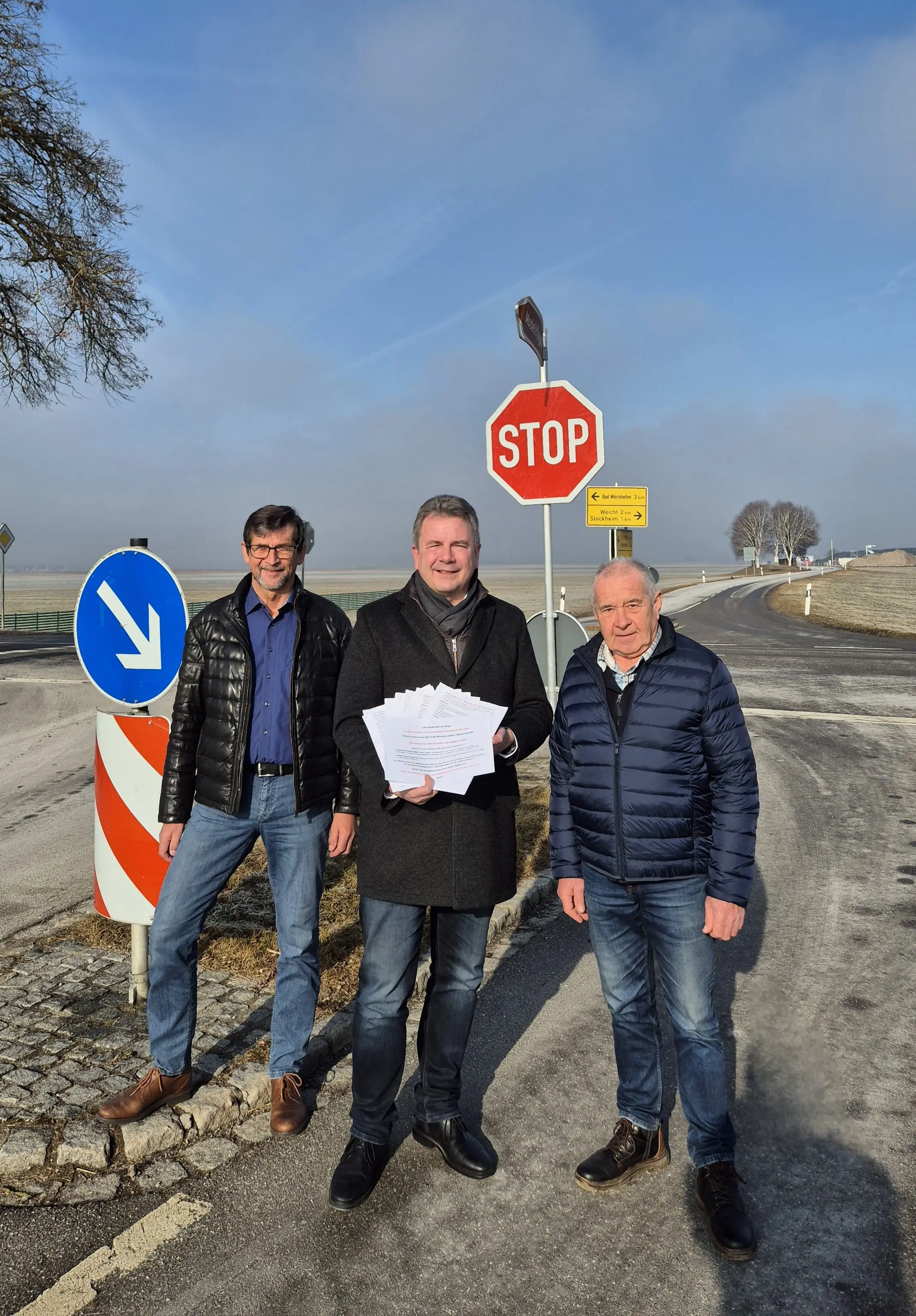 Mitte November war die sogenannte „Boscha-Kreuzung“ westlich von Stockheim eines der Themen bei der Bürgerversammlung. Anton Schreiegg stellte damals die Frage, ob eine Unterschriftensammlung für einen Kreisverkehr hier weiterhelfen kann. Bürgermeister Stefan Welzel (Bad Wörishofer Bürgerinnen- und Bürgerliste, BWB) ermunterte ihn daraufhin, zur Tat zu schreiten. Nunmehr ist das Ergebnis der Aktion bekannt: Anton Schreiegg und Josef Trübenbacher überreichten Bürgermeister Stefan Welzel 390 Unterschriften. Alle Unterzeichner sind für die zeitnahe Errichtung eines Kreisverkehrs an der Kreuzung der Kreisstraße MN 29 mit der Wertachtalstraße.