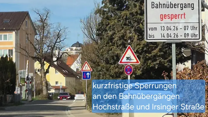 Vom Montag, 13.4.2026, 7 Uhr, bis Dienstag, 14.4., spätestens 9 Uhr, sind die beiden Bahnübergänge Hochstraße und Irsinger Straße für den Verkehr komplett gesperrt. Grund sind Gleis-Arbeiten.