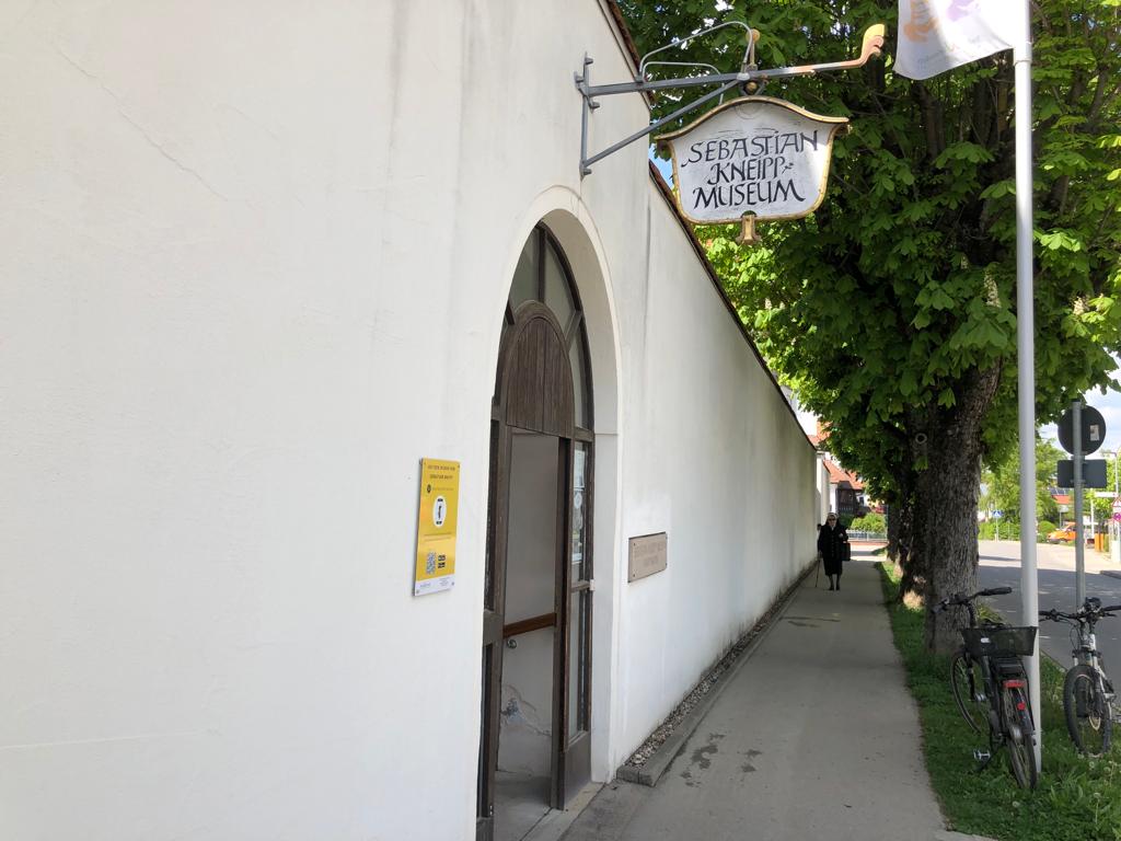 Panoramabild von Bad Wörishofen, mit Kloster und Kirche im Blick, Bäume und blauer Himmel