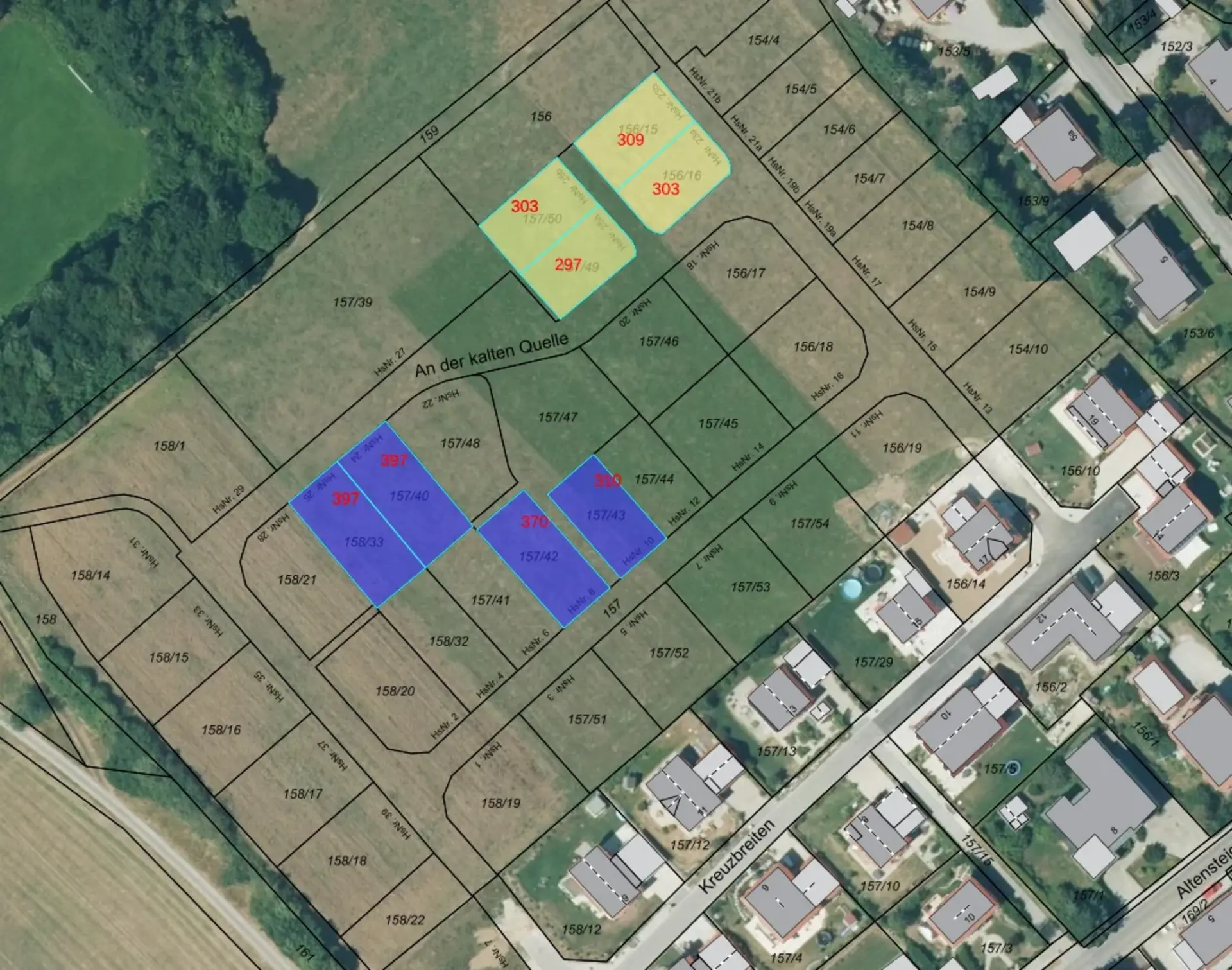 Die Grundstücksgrößen liegen bei etwa 300 bis 400 m². Die zum Verkauf stehenden Grundstücke sowie deren Größe können der Grafik entnommen werden.